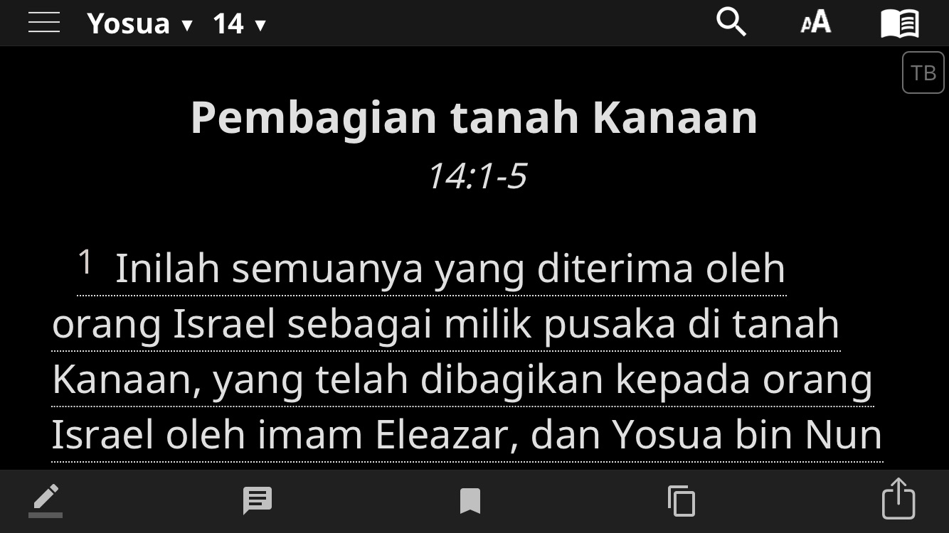 Berikut ini tampilan ayat-ayat Firman Tuhan dalam Kitab Yosua (Joshua 14:1-5 dengan judul perikop Pembagian Tanah Kanaan).